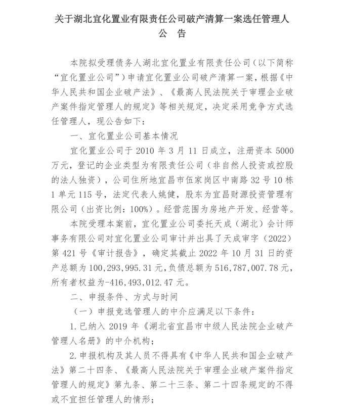 宜昌市伍家岗区人民法院关于湖北宜化置业有限责任公司破产清算一案选任管理人公告
