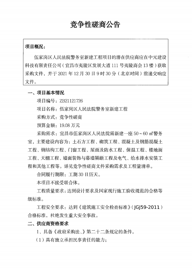伍家岗区人民法院警务室新建工程竞争性磋商公告