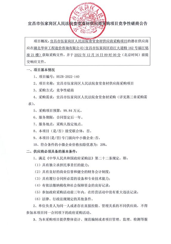 宜昌市伍家岗区人民法院食堂食材供应商采购项目竞争性磋商公告